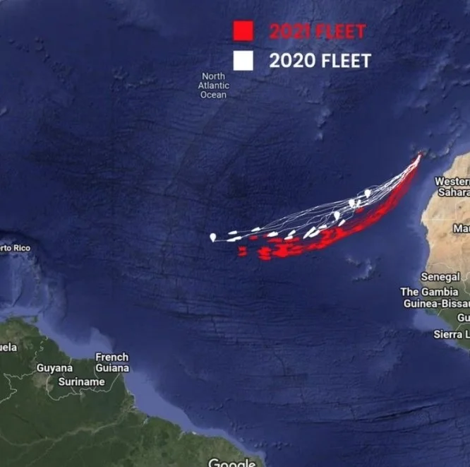 This image shows the fleets from 2020 and 2021 at the same time in the race. White is 2020, red is 2021. The fleet has made a general shift of roughly 130NM further south this year.